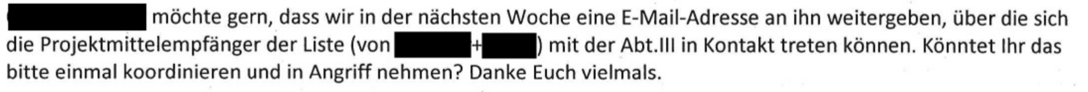 Auf Wunsch des CDU-Abgeordneten Goiny wird eine eigene E-Mail-Adresse für jene Projekte eingerichtet, die auf der Liste stehen. Diese Liste wurde höchstwahrscheinlich bei dem Termin zwischen Chialo, Stettner und Goiny am 24. Februar 2025 erarbeitet. Die beiden geschwärzten Namen in den Dokumenten, die wir veröffentlichen, sind Stettner und Goiny.