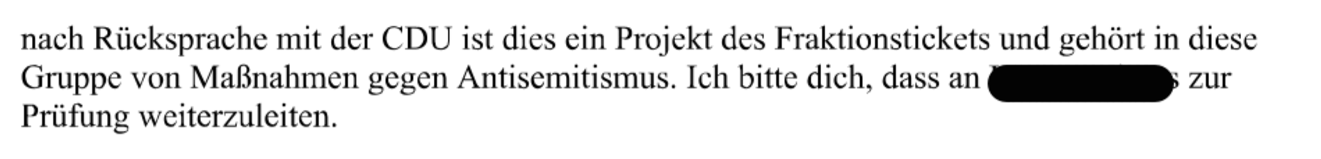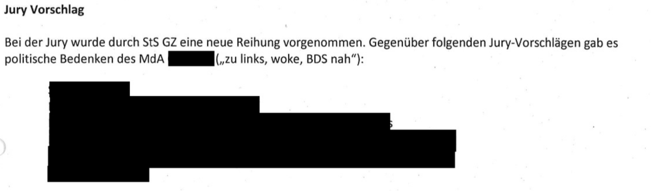 Die Bewertung der Projekte wird von einer Fachjury übernommen. In einer E-Mail steht, dass ein Abgeordneter „politische Bedenken“ gegenüber Jury-Mitgliedern habe. Sie seien „zu links woke, BDS nah“. Bei dem Abgeordneten handelt es sich um Goiny.