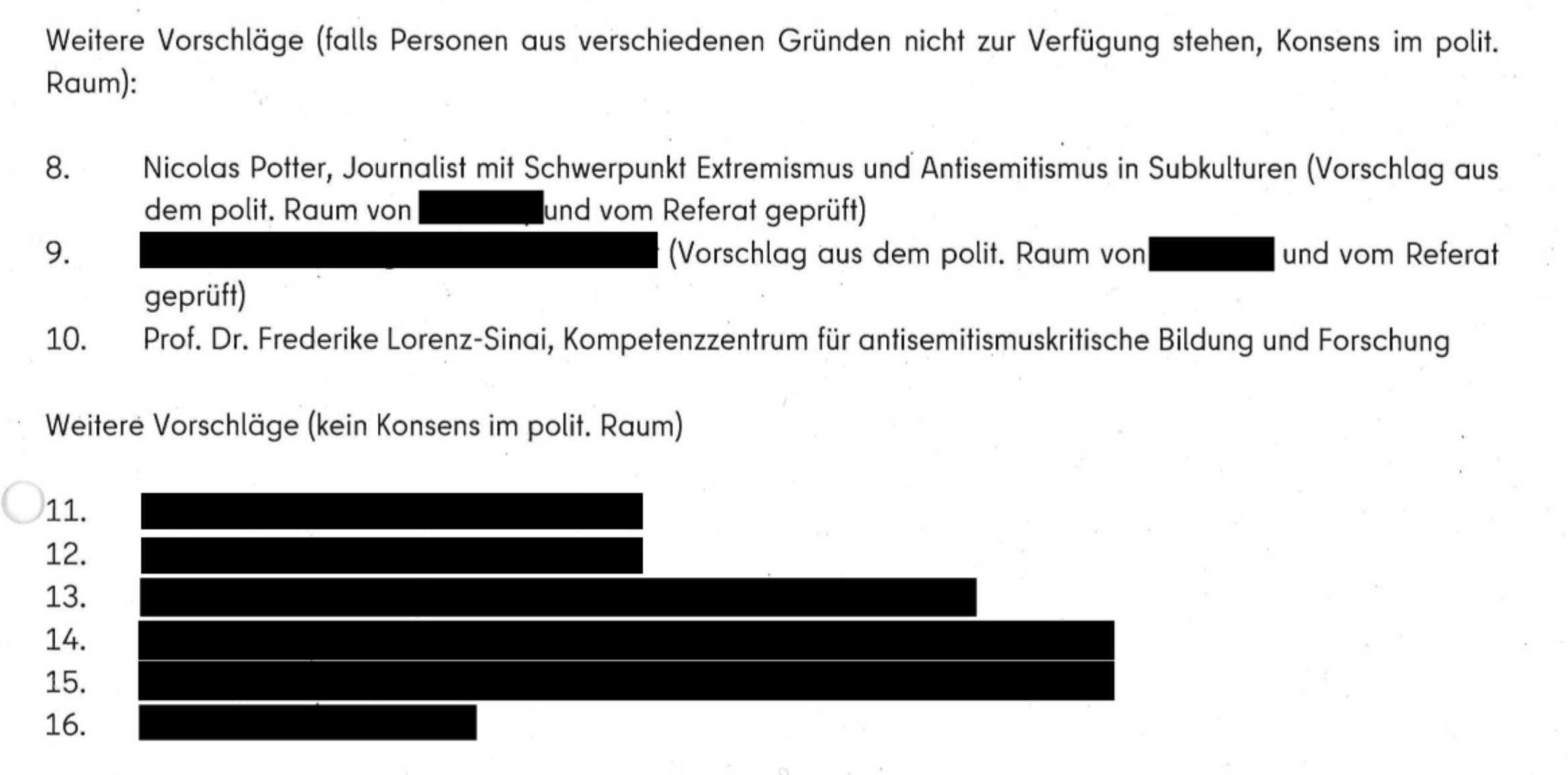 Ein angepasster Vorschlag der Jury-Reihung „nach politischer Absprache“ wird verschickt. Dabei wird in Personen mit „Konsens im polit. [Anm.:politischen] Raum“ und „kein Konsens im polit. Raum“ unterteilt.