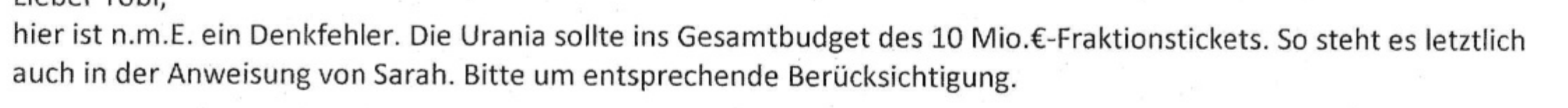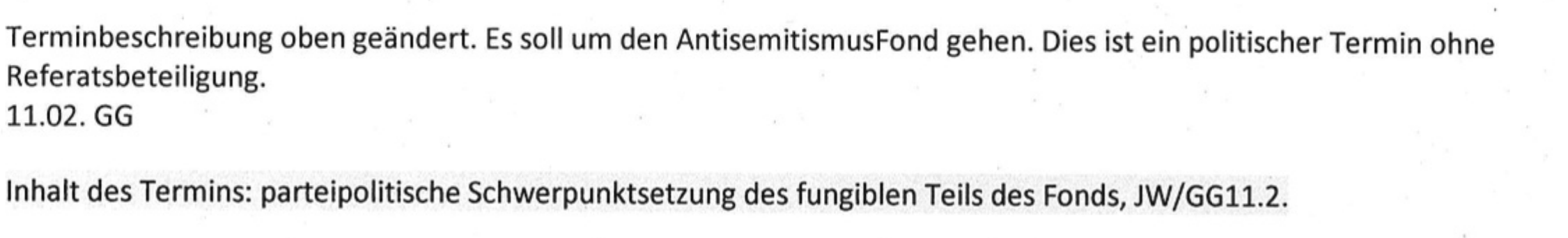 Ein Termin wird vereinbart zwischen Senator Joe Chialo, Staatssekretär Oliver Friederici, dem CDU-Fraktionsvorsitzenden Dirk Stettner und dem Haushaltspolitlitischen Sprecher der CDU-Fraktion Christian Goiny. Der Inhalt des Treffens ist die „parteipolitische Schwerpunktsetzung des fungiblen Teils des Fonds“ – also der 3,4 Millionen Euro.