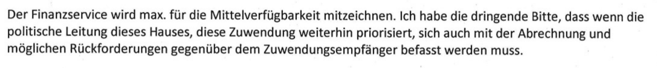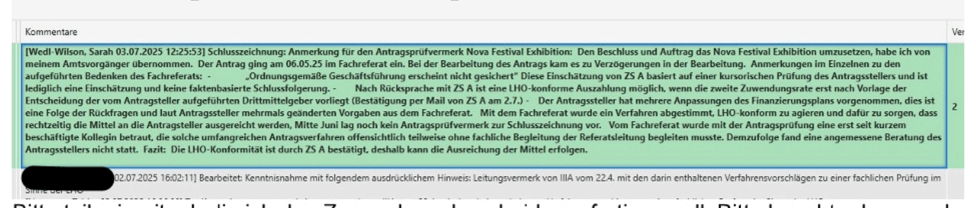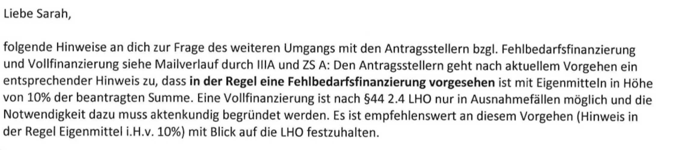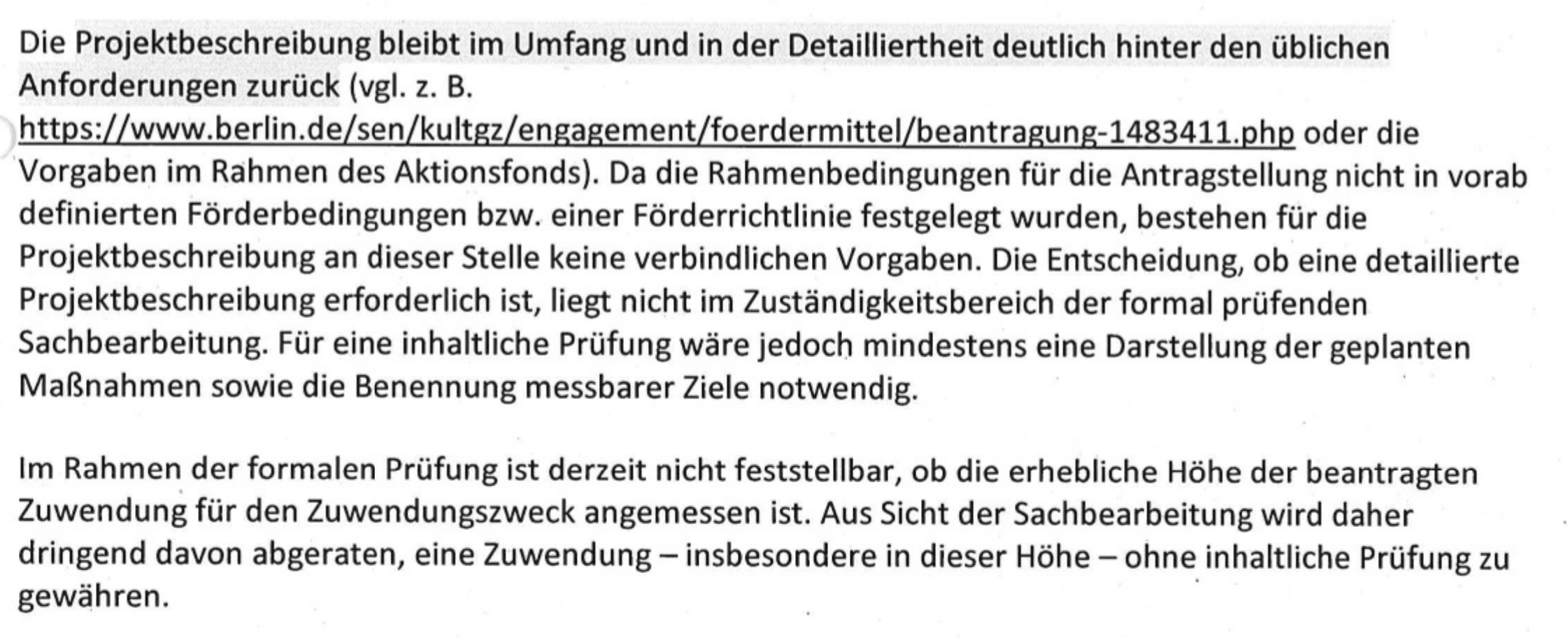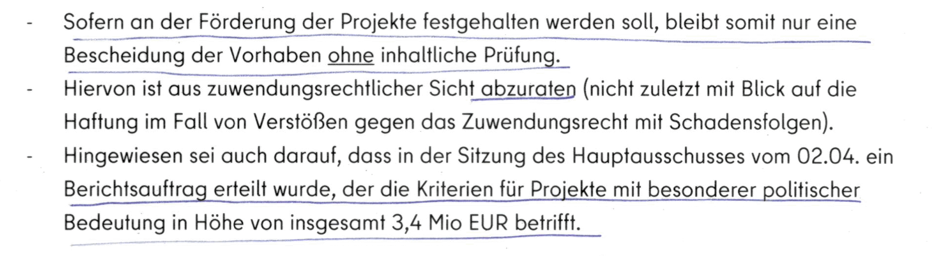 Innerhalb der Verwaltung wird über ein Projekt auf der Liste diskutiert. Vorrangig geht es um die formale Prüfung. Die Projektbeschreibung sei „deutlich hinter den üblichen Anforderungen zurück“. Die hohen Kosten, die beantragt wurden, seien daraus nicht erklärbar. Das Problem sei allerdings generell, dass vorab keine Förderbedingungen definiert wurden. Es wird „dringend“ davon abgeraten dieses Projekt zu fördern.