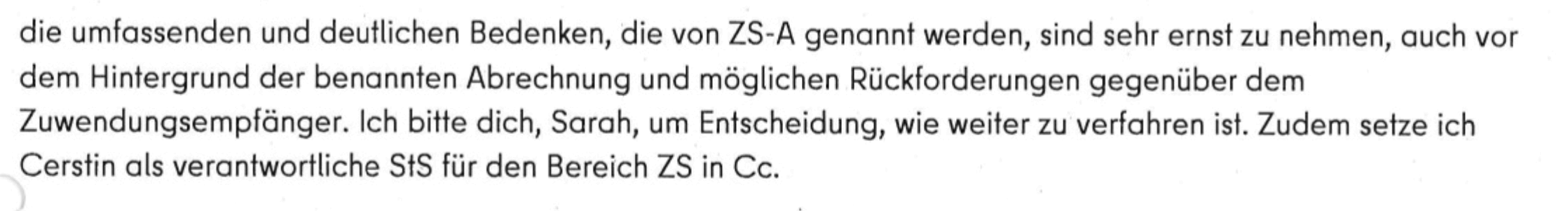 Zu der E-Mail vom 18. Juni schaltet sich nun auch die Abteilung ZS (Zentraler Service Finanzen und Prüfdienst) ein. In mehreren Punkten stellt sie klar, was gegen eine Antragsbewilligung spricht. Die Abteilung teilt mit, dass sie nicht vollständig hinter der Bewilligung stehe, sollte dennoch an ihr festgehalten werden.
