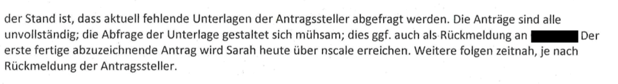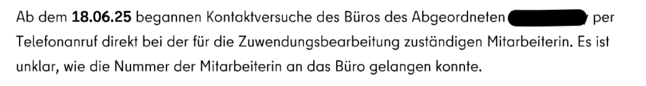 Die zuständige Abteilung erstellt, wie am 1. Juli angekündigt, einen umfangreichen Vermerk. Es wird detailliert auf mehreren Seiten aufgelistet, wer zu welchem Zeitpunkt worüber informiert wurde, welche Informationen fehlen und wer intervenierte. Unter anderem hätte es seit Mitte Mai mehrere Anrufe eines CDU-Abgeordneten an die zuständige Mitarbeiterin gegeben. Der Sachbearbeiter wundert sich selbst, wie die Telefonnummer zu dem Abgeordneten gelangt sei. Der Abgeordnete war laut unseren Recherchen Goiny.