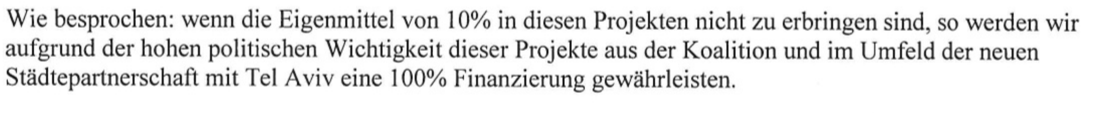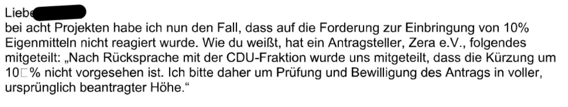 Mehrere Projekte sollen nicht auf den Hinweis der Verwaltung reagiert haben, dass sie nicht ausreichend Eigenmittel zur Verfügung hätten. Ein Projekt, zu dem der Spiegel bereits recherchiert hat, hätte geschrieben: „Nach Rücksprache mit der CDU-Fraktion wurde uns mitgeteilt, dass die Kürzung um 10% nicht vorgesehen ist.“ Daher soll der Antrag in „voller, ursprünglich beantragter Höhe“ bewilligt werden, also ohne Eigenmittel. Das fordert der Antragsteller.