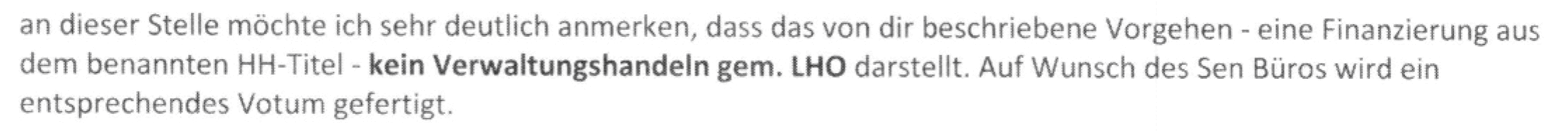 Staatssekretär Friederici antwortet auf die E-Mail des Senators. Er schreibt, dass „keine Förderstruktur existiert“. Es müssten „aufwändige Einzelfallprüfungen vorgenommen werden“ und es fehle an Expertise in den zuständigen Stellen. Zusätzlich würden laufende Gespräche mit Abgeordneten und anderen Verwaltungen den Prozess verlangsamen.