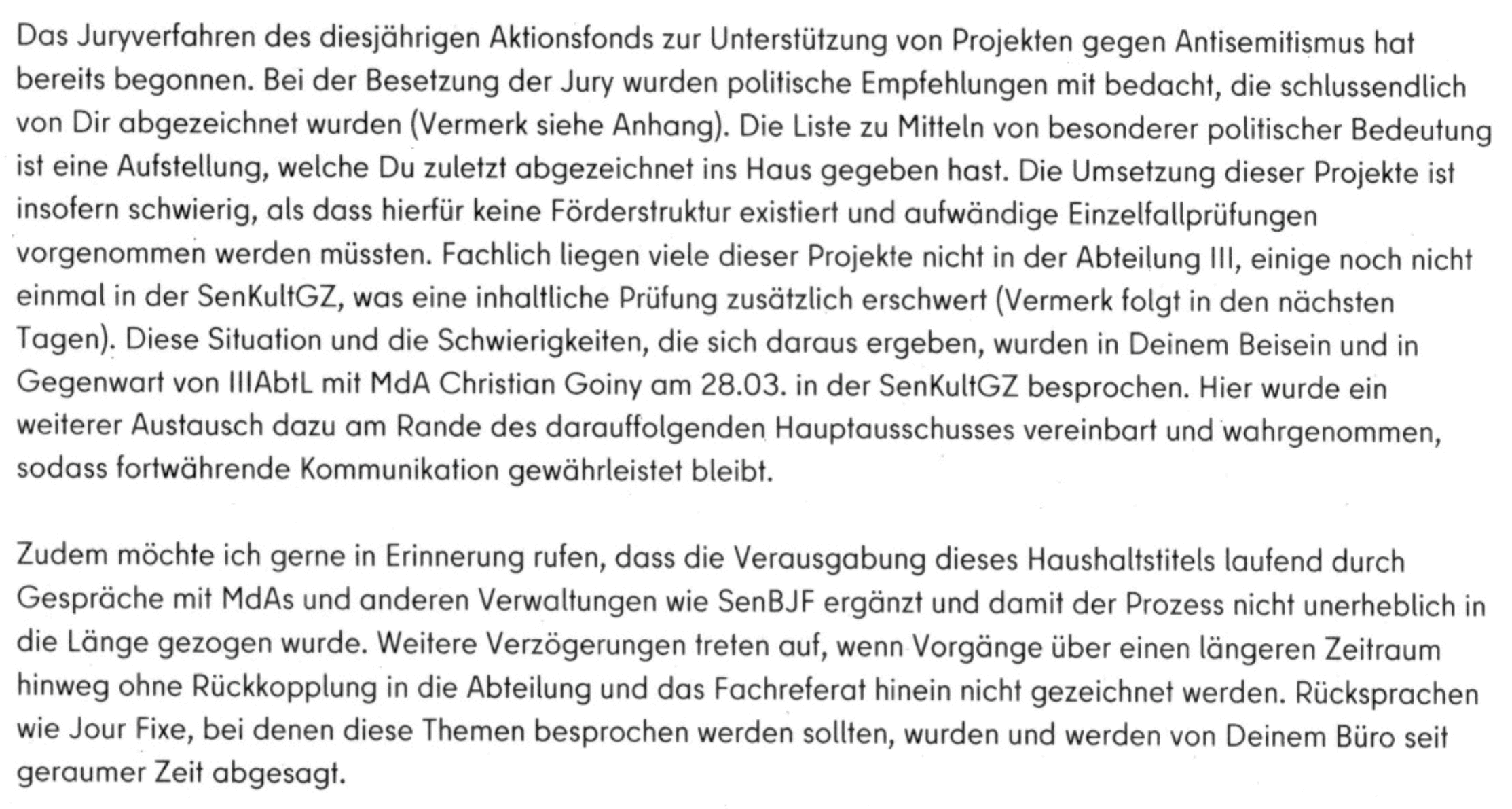 Eine neue Leitungsvorlage wird von der Verwaltung vorgelegt. Darin spiegelt sich wieder, wie im März und Anfang April 2025 die Zuständigkeit für die Projekt-Liste und die Fördergelder hin und her geschoben wurde. Klar sei, dass es für die Prüfung der Anträge eine „ausreichende fachliche Expertise“ brauche. Jedoch sei unklar, welches Referat darüber verfüge. Die Fachjury, die für die anderen Gelder zuständig ist, sei hier keine Option. Also bleibe nur eine „Bescheidung ohne inhaltliche Prüfung“ übrig. Die Verantwortung dafür trage die Hausleitung. Die Leitungsvorlage wird laut Vermerk Anfang Mai 2025 von Chialo gezeichnet.