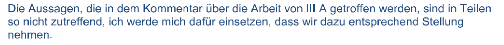 Darauf antwortet die zuständige Abteilung am selben Tag, dass die Aussagen der Senatorin in dem Kommentar so nicht zutreffend seien.